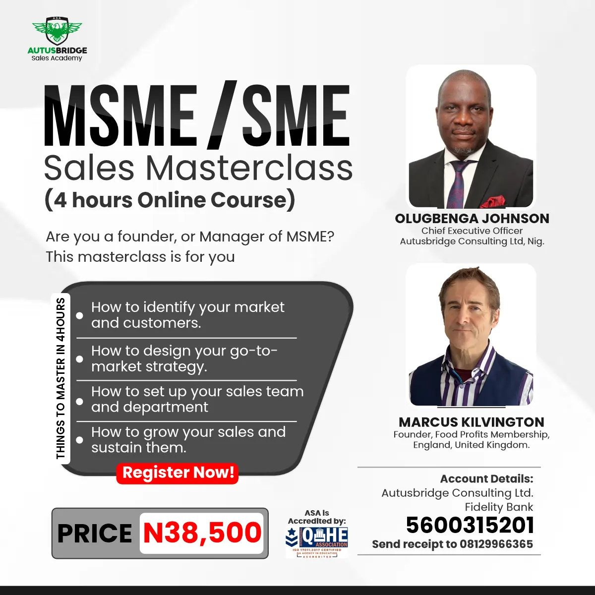 This is an intensive online course designed for founders, managers, and sales leaders. Led by industry experts Olugbenga Johnson (CEO, Autusbridge Consulting) and Marcus Kilvington (Founder, Food Profits Membership, UK), this masterclass delivers actionable strategies to: